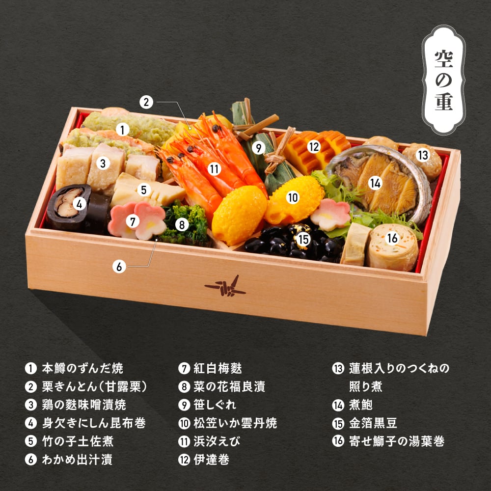 本鱒のずんだ焼/栗きんとん(甘露栗)/鶏の麩味噌漬焼/身欠きにしん昆布巻/竹の子土佐煮/わかめ出汁漬/紅白梅麩/菜の花福良漬/笹しぐれ/松笠いか雲丹焼/浜汐えび/伊達巻/ほたて貝山椒煮/煮鮑/金箔黒豆/寄せ鰤子の湯葉巻