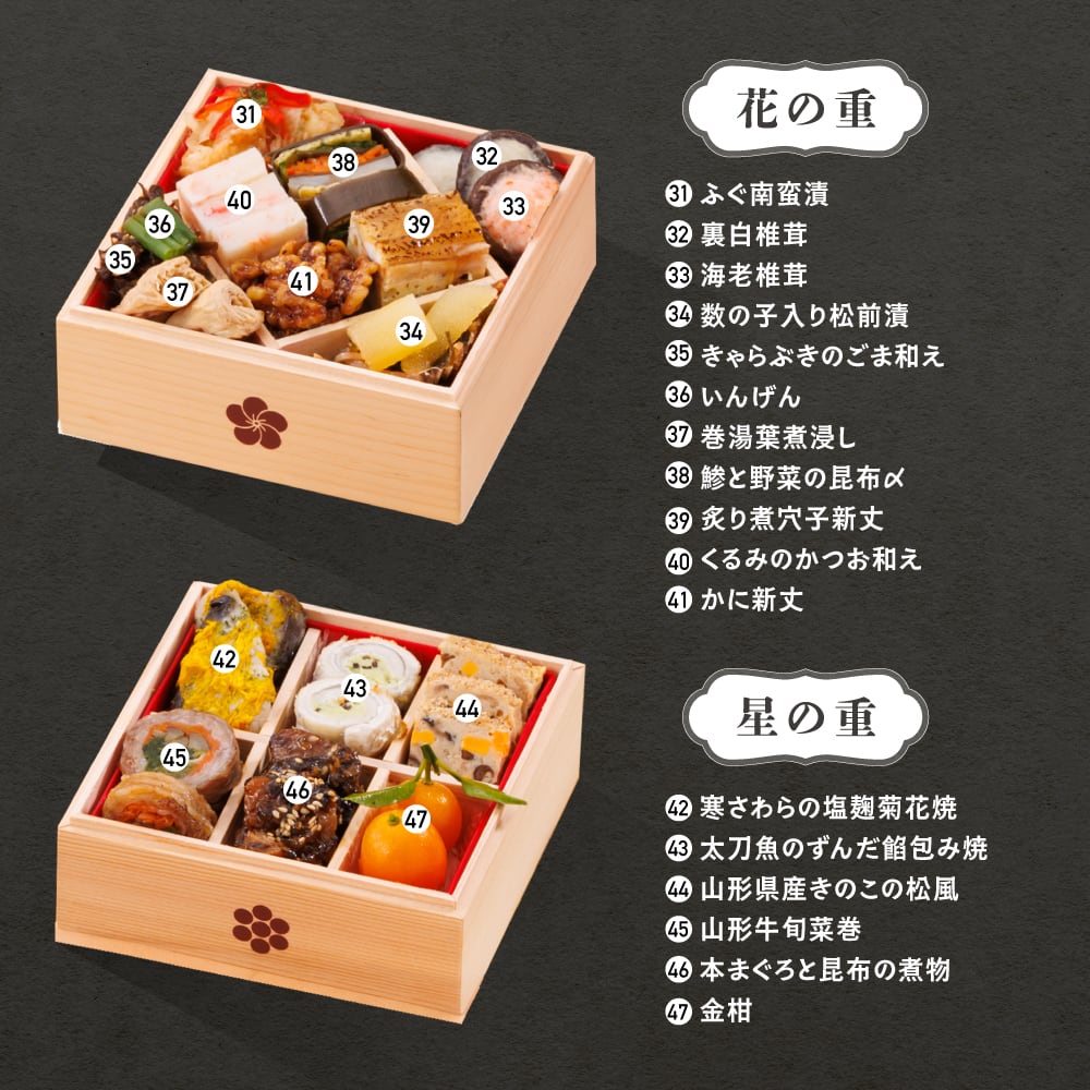 他にも山形地鶏の照り焼きや栗きんとんなど、伝統的なおせち料理から現代風の料理まで品目も多く豪華な御重となっております。
