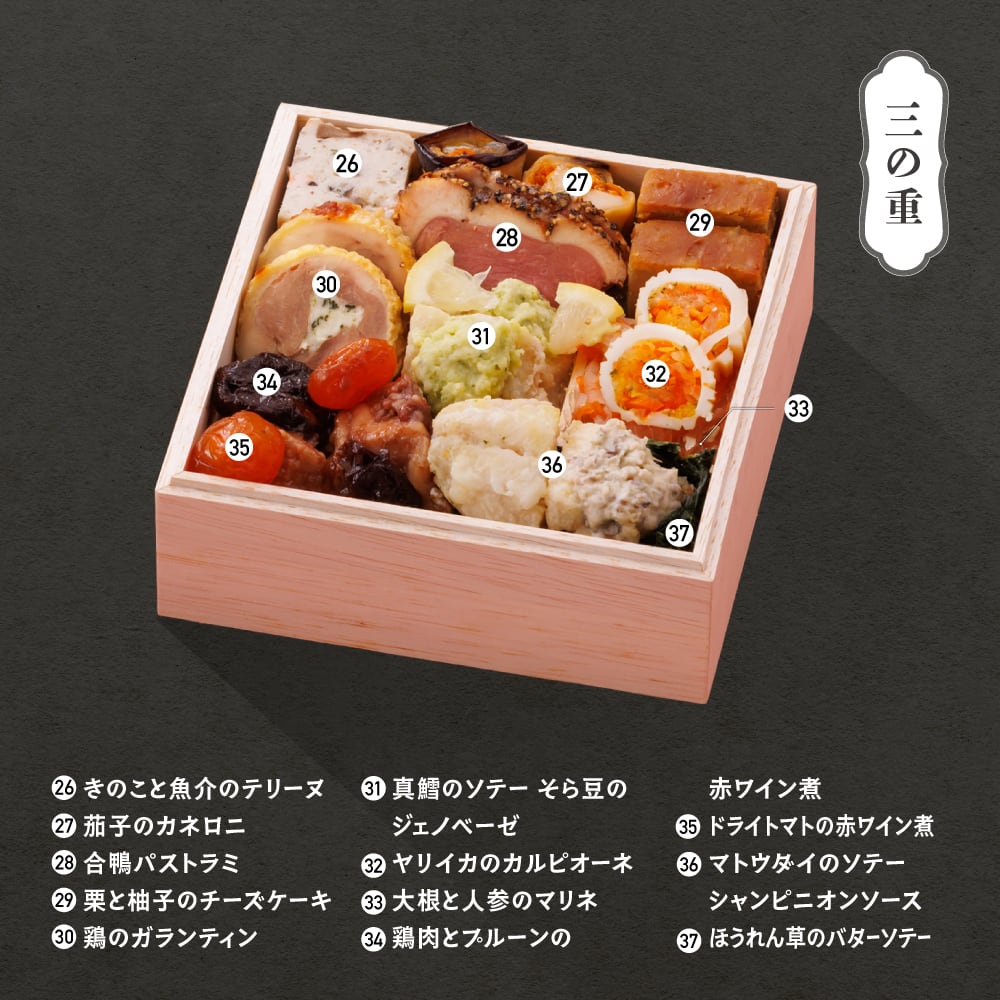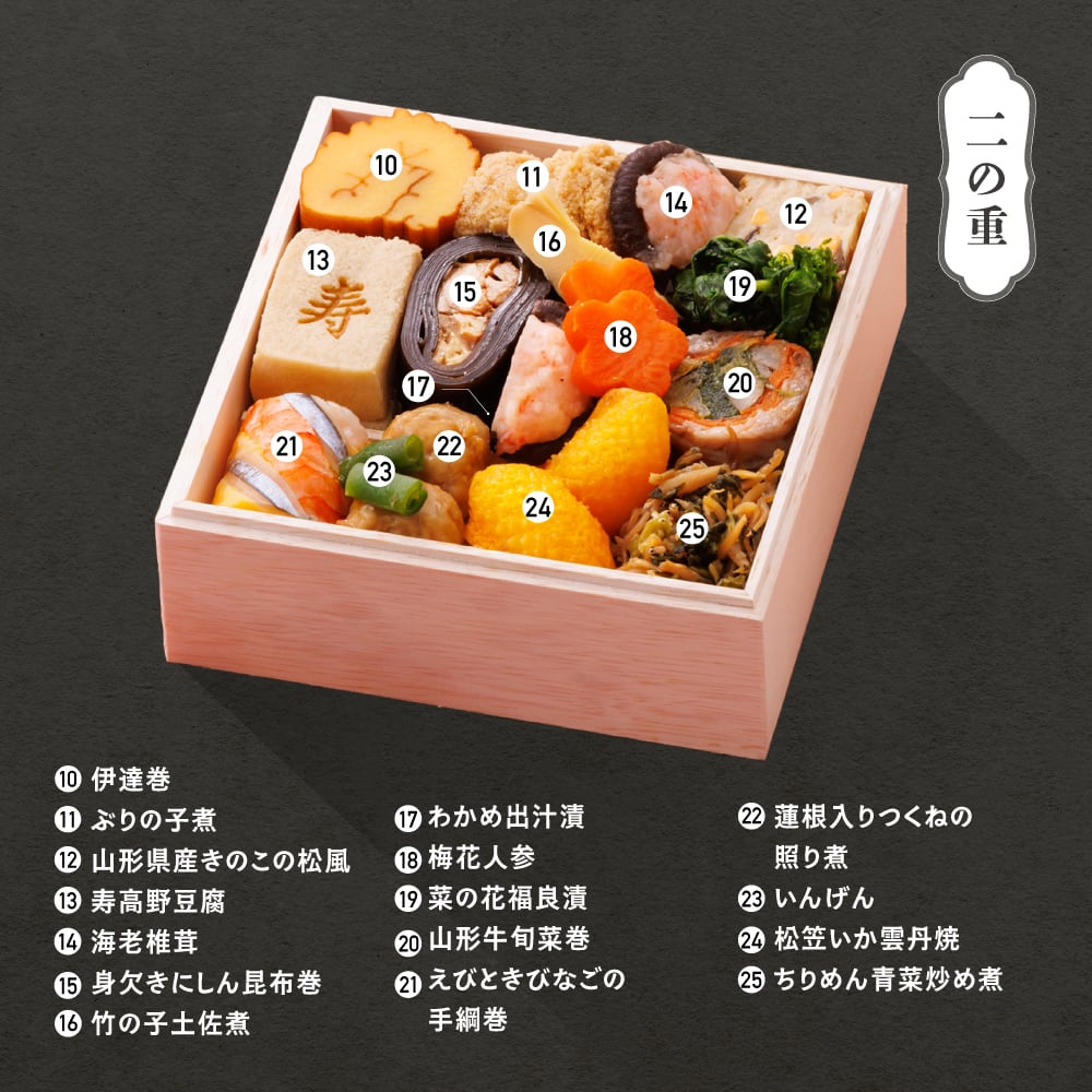 伊達巻 / ぶりの子煮 / 山形県産きのこの松風 / 寿高野豆腐 / 海老椎茸 / 身欠きにしん昆布巻 / 竹の子土佐煮 / わかめ出汁漬 / 梅花人参 / 菜の花福良漬 / 山形牛旬菜巻 / えびときびなごの手綱巻 / 蓮根入りつくねの照り煮